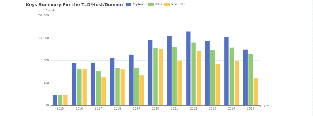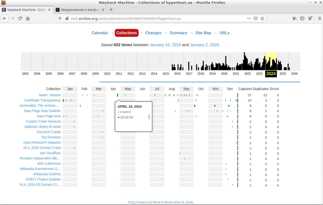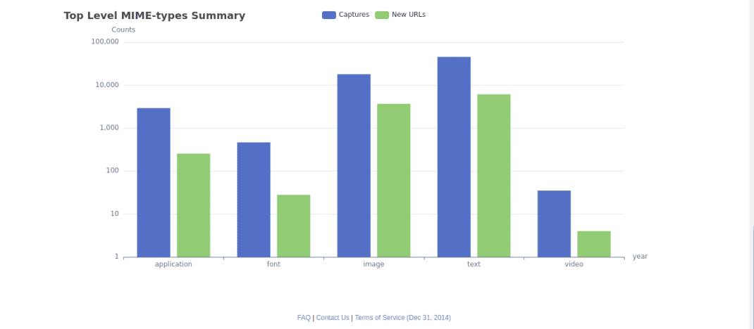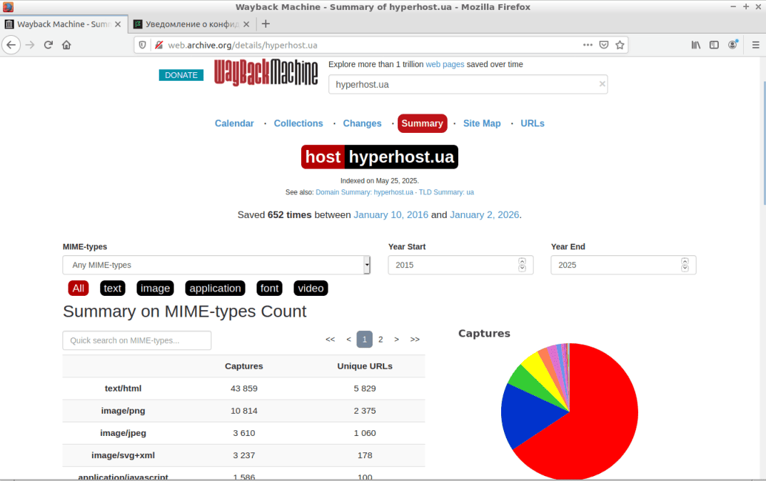 Итоговая информация (Summary). Здесь выводится сводная информация по истории изменения веб-ресурса, включая статистику по количеству созданных копий, активность роботов и многое другое (см. скриншоты).