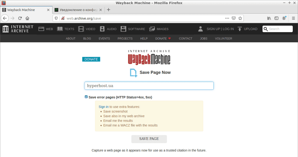 Инициировать процесс сохранения веб-страниц ресурса может и обычный пользователь сети, введя в специальной форме на главной странице сервиса адрес сайта, как, например, показано ниже на скриншоте. В этом случае URL ресурса будет сохранён системой и впоследствии использован роботом для занесения сайта в архив.