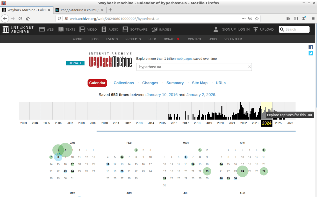 Календарь. При нажатой вкладке и выборе с помощью мыши интересующего нас года на графике архивации, сервис отобразит на календаре выделенные разными цветами даты. (см. скриншот). Наличие для определённых дат кругов разных размеров и цвета говорит об уровне интенсивности работы веб-краулера в этот день и об успешности выполненных операций по созданию копий. Чем больше площадь круга, тем чаще робот обращался к веб-ресурсу. Цвет круга показывает степень успешности операции: синий – ОК, зелёный – возврат кода 3xx, красный и оранжевый – возврат кода ошибок 4xx или 5xx в случае недоступности ресурса.