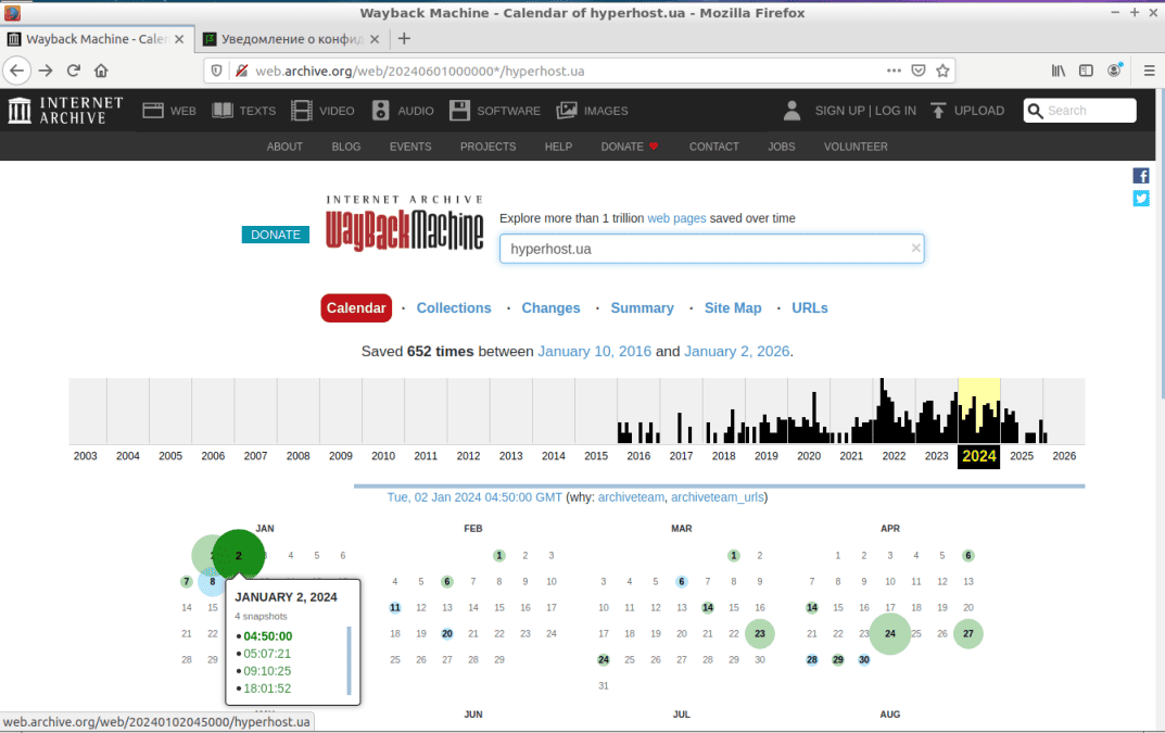 Для примера, попытаемся просмотреть версию исследуемого нами сайта по состоянию на 2 января 2024 года. Для этого достаточно кликнуть мышью по выбранной дате в календаре, и в появившемся меню выбрать время, когда робот посещал сайт. В нашем случае – это 4 часа 50 минут (см. скриншот).