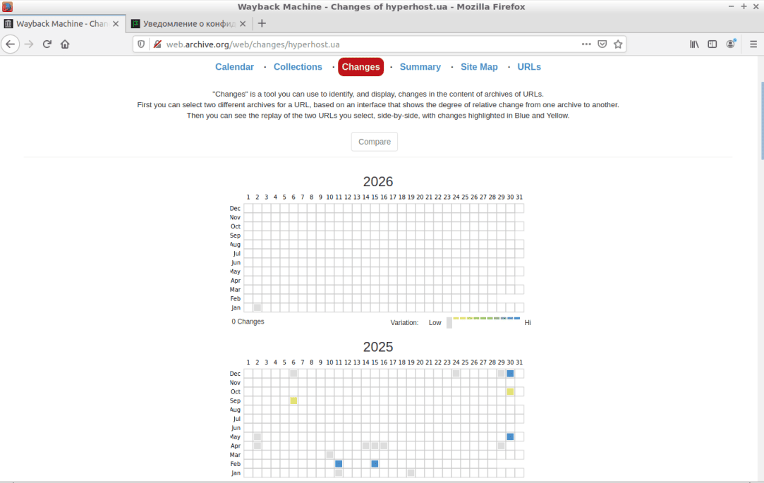 При этом инициируется загрузка страницы сервиса по выбранному ресурсу, на которой будет выведен график архивации сайта за весь период его «жизни», а также календарь создания копий для выбранного сайта. В верхней части загруженной страницы находится несколько функциональных вкладок: Календарь, Коллекции, Изменения, Итоговая информация, Карта сайта и URLs (см. скриншот). Рассмотрим назначение этих вкладок подробнее.