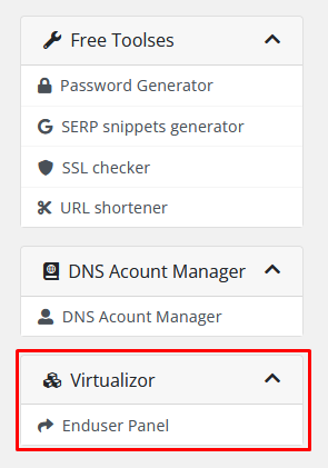 После загрузки страницы с полной информацией о заказанном сервере необходимо перейти в панель управления гипервизором. Для этого обратите внимание на блоки с модульными действиями в левой части экрана и найдите ниже блок "Virtualizor".